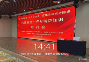下午三点,在双创中心海贝酒店3层2号会议室君悦厅,参会人员集中观看“2025年全国安全生产月活动主题片”,随后由淮南高新区消防救援大队讲解消防安全知识及应急逃生技能。
