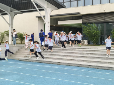 随着警报声响起,现场工作人员和学校老师们迅速组织学生们按照疏散转移方案,提醒班级里学生们用双手保护头部,就近采取避震措施,蜷缩身体躲在桌下或墙角,保持冷静,按照要求沿着指定的安全通道快速撤离至操场空旷地带。到达集合地点后,各班老师立即清点人员,确保所有学生都安全抵达,并向现场总指挥汇报;整个疏散过程中未出现拥挤踩踏情况,达到了演练预期的效果。