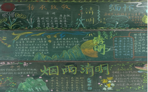 1. 黑板报评比:各中队以“清明”“致敬”为主题精心设计板报,图文并茂展现传统文化与革命精神。一幅幅设计精美的黑板报不仅色彩绚丽,而且文字工整,蕴含着队员们对传统文化的独特理解与感悟。