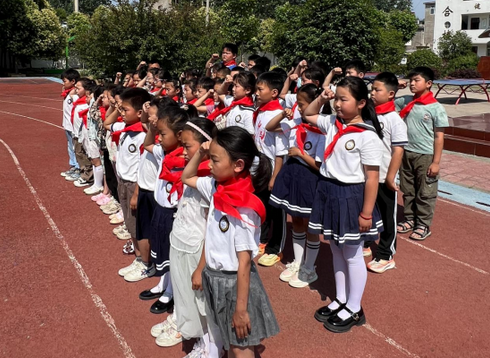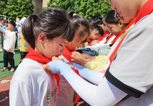 仪式在激昂的出旗曲中拉开序幕。护旗手步伐整齐,高举队旗庄严入场,全体师生高唱中国少年先锋队队歌,嘹亮的歌声响彻校园。随后,大队辅导员孙老师宣读入队名单,老队员为新队员佩戴红领巾。鲜艳的红领巾飘扬在胸前,新队员们身姿挺拔,眼神坚定,郑重地向老队员敬队礼,完成了少先队精神的传承交接。